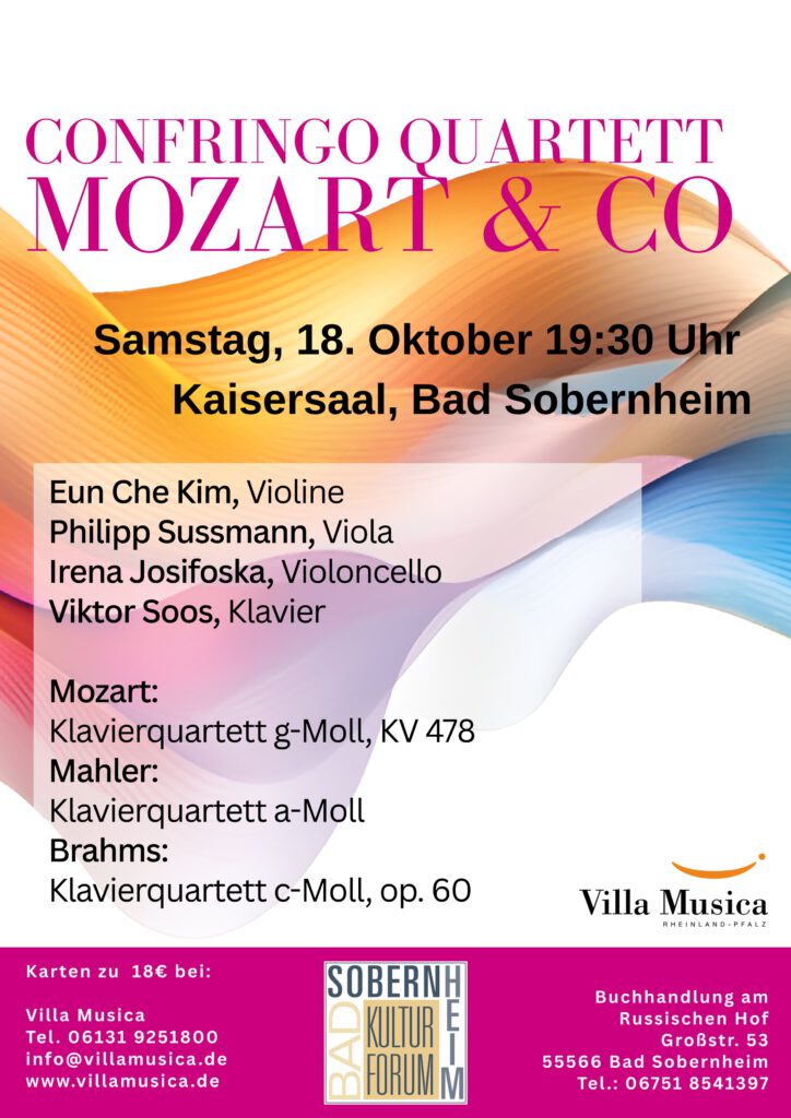 Nach den Erfolgen der letzten Jahre konnten wir wieder die Stiftung „Villa Musica“ für ein weiteres Konzert im Herbst 2025 gewinnen. Dieses mal wird das Confringo-Quartett auftreten und Mozart, Mahler und Brahms-Klavierquartette spielen:
